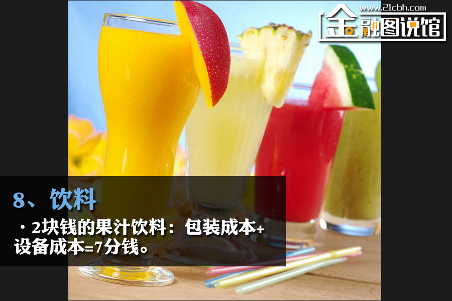 其中非碳酸类果汁饮料的利润最大,售价2块钱的果汁饮料,包装成本+设备成本只有7分钱。