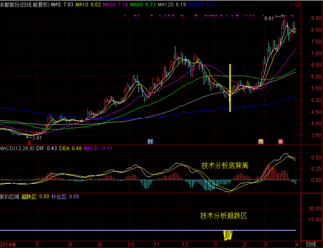 我们以宋都股份为例,该股在2015年1月份,出现技术分析上的超跌+背离,构建技术买点: