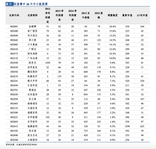 最终从 1184 只中小板和创业板个股中筛选出 50 个标的。这一轮市场从 2012 年底至今,创业板涨幅 380%,创蓝筹涨幅 525%。