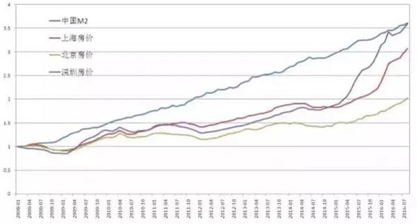 他的“图说”这样写:“房价是一种货币现象,大家看看M2(广义货币)的增速,再看看北上广深的房价,你会发现,相比货币增速,房价涨幅还是慢了。考虑到货币存量和增速水平,房价将持续高位运行,且还有上涨空间。”